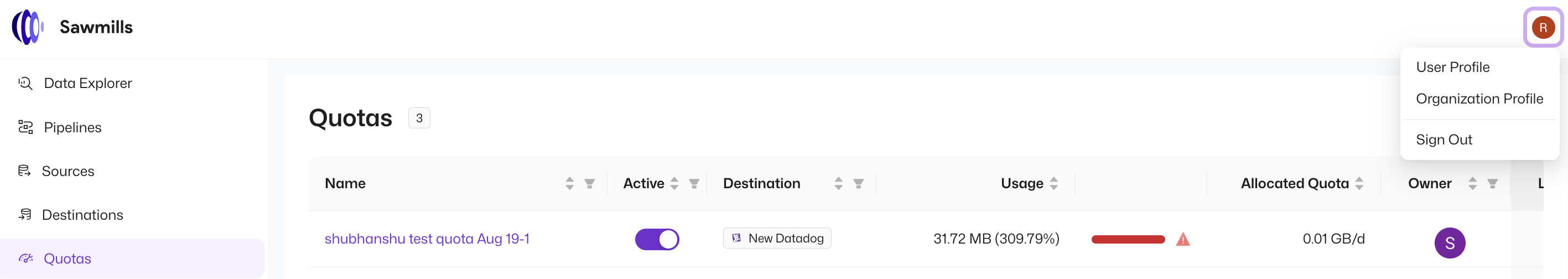 This section explains how to use the user invitation system within Sawmills platform. The system provides flexibility by offering three different invitation methods, allowing administrators to choose the best approach for their organization. Before inviting users to your organization, follow these steps to configure your organization’s invitation method- Navigate to Your Profile: