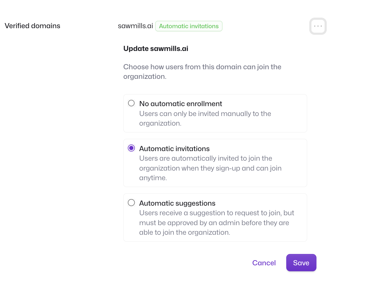 - Users receive a suggestion to request to join the organization when they sign up. the org is defined by the verified domain the admin configures.